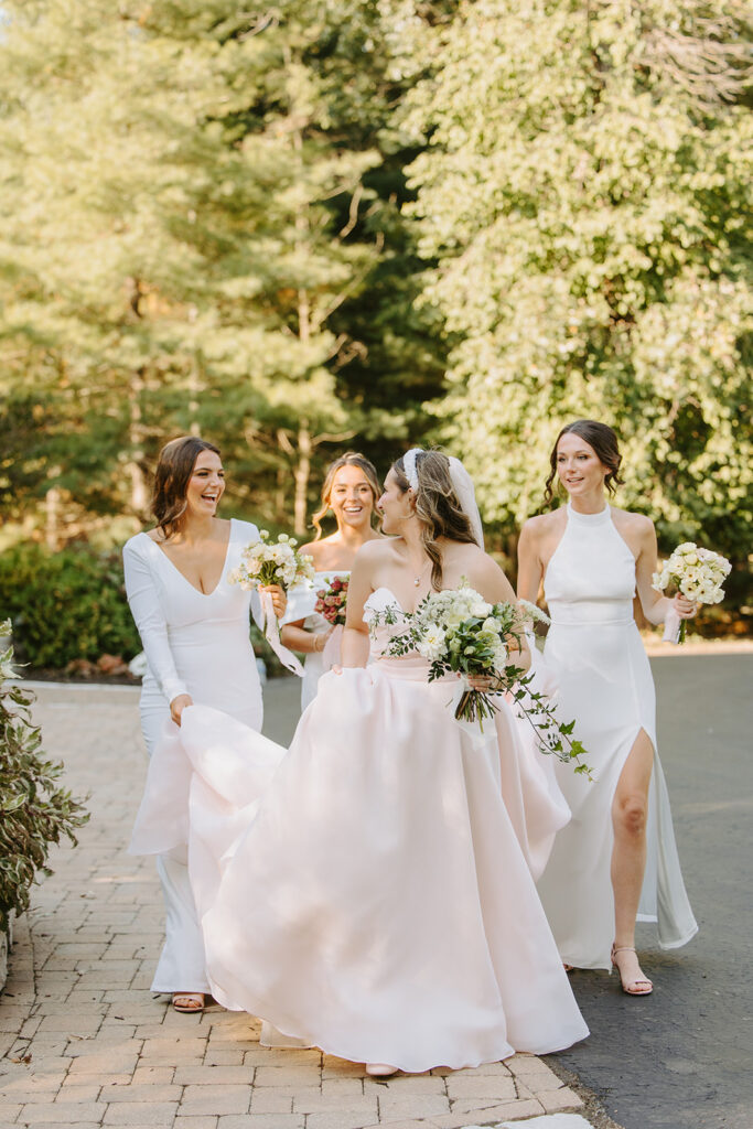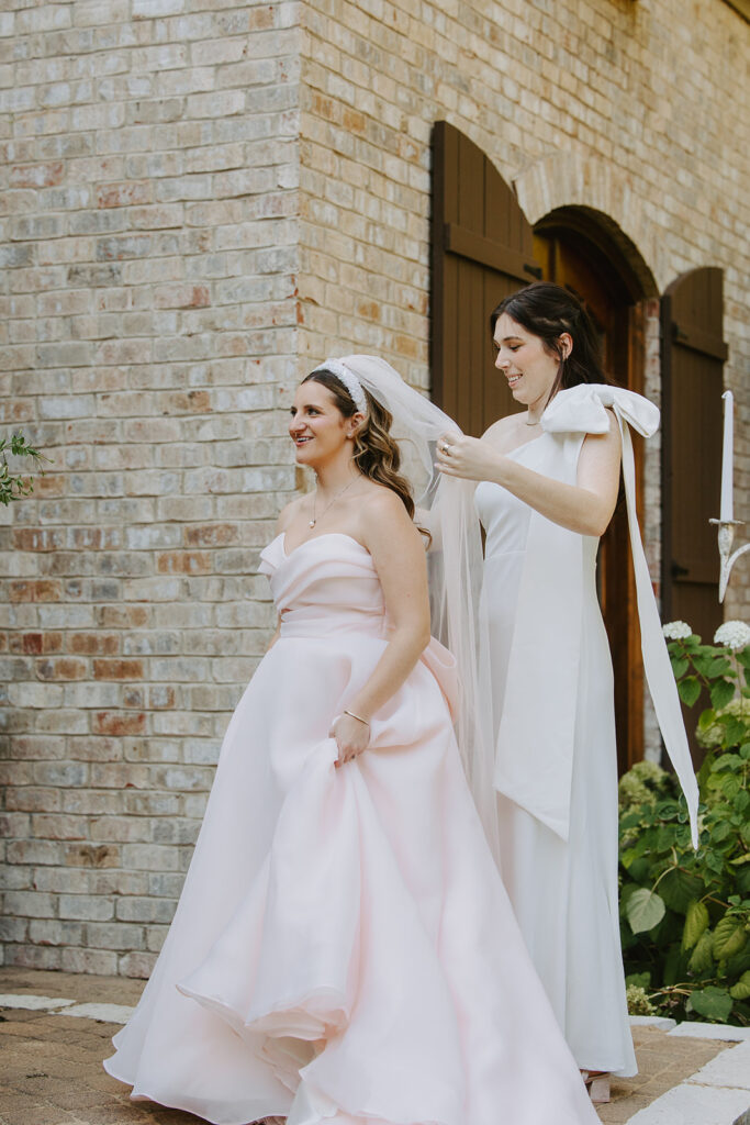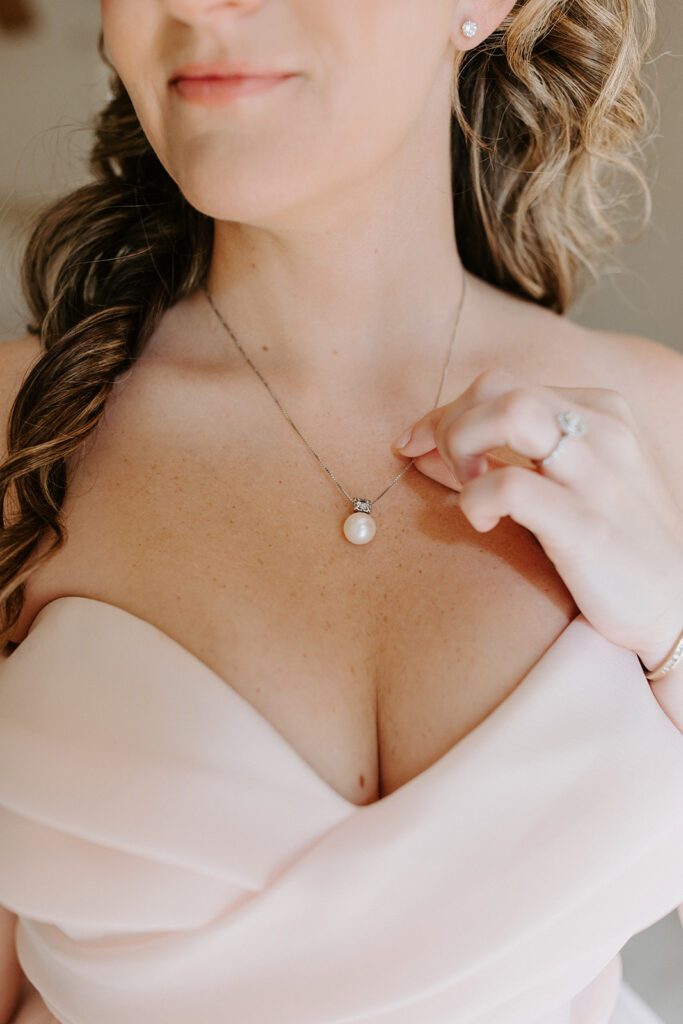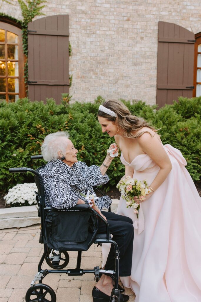 A blush dress for her mom. A headband, jacket, and robe made from her mother’s gown. Jewelry passed through generations.